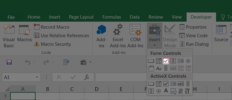Mở Excel vào thẻ Developer > Chọn mục Insert > Chọn icon Checklist > Nhấn chuột trái để dán icon icon Checklist vào đúng vị trí bạn muốn.